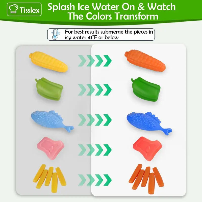 How To Play - First, you need to put the ice & cold water into the cooking box.When you turn on the switch, the water will out of the hole with "Gulu-Gulu" sound.Put in the food and seasonings you want to eat, wait for the food to cook (Color Changing), then pull it on a plate.You can start enjoying the delicious meal you have made.Toy kitchen playset stimulates your child's creative thinking and also improves their social skills