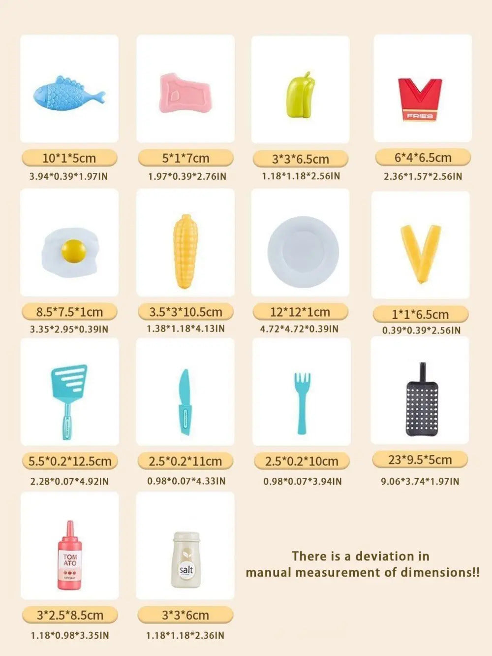 Multiple Play Food Options - The play kitchen accessories toys come with a variety of toy food that can be "fried" in the fryer pan, including French fries, Fish, Steak, Peppers, Eggs & Corn.Perfectly reproduces the appearance of real food, bringing children a more realistic perception of ingredients.The color of food toy will change after cooking, perfect for pretend play, kitchen game, Christmas gift, birthday gift or any gift for boys and girls