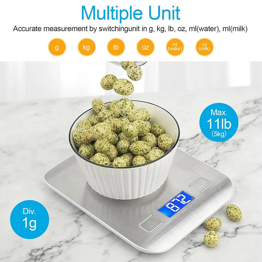 Specification:Origin: Mainland ChinaShape: SquareCertification: CEMaterial: ABS+stainless steelColor: silverSpecification: 5000gPower supply: AAA*2 (the product does not contain batteries)Display: LCD digital displayAccuracy: 1gAllowable error range: ±0. 2%+1Display size: 41*19mmButtons: switch on/off/clear button, unit conversion buttonProduct functions: unit switching function, peeling and clearing function, overload protection function, low-power display function. Unit: g, lb, oz, kg, ml, milk mlProduct size: 180. 00x140. 00x17. 00mm/7. 09x5. 51x0. 67inchWeight: 250gNote:Due to the different monitor and light effect, the actual color of the item might be slightly different from the color showed on the pictures. Thank you!Please allow 1-2cm measuring deviation due to manual measurement.5Kg Electronic Smart Balance LCD Display Mini Precision Weight Scale Precise Small Platform Scale Cooking Baking Measuring Tools Features:1. Accurate and Versatile: This multi-functional kitchen digital scale provides precise measurements down to 1g, helping you accurately weigh ingredients for healthier portions and closely follow recipes, making baking and cooking easier.2. Ideal for Various Ingredients: The electronic smart balance is perfect for measuring ingredients and liquids up to 5KG. It is especially suitable for individuals managing diabetes, baby food, bodybuilding, weight loss, and more.3. Convenient One-Touch Unit Conversion: The mini precision weight scale can measure in g, lb, oz, kg, ml, and milk ml. Its convenient tare function allows you to subtract the weight of plates or containers, ensuring accurate ingredient readings for all your weighing needs.4. Easy to Clean Design: The precise small platform scale features a large, stylish glass platform that is easy to clean, making it a practical and hygienic choice for any kitchen.5. Portable and User-Friendly: This portable weights scale is designed for ease of use and portability, making it a handy tool for all your cooking and baking adventures, whether at home or on the go. 1 xKitchen Digital Scale1 x Instruction Manual