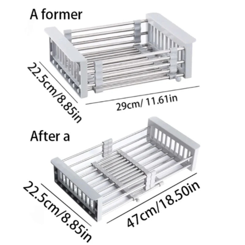 Adjustable Over-The-Sink Dish Drying Rack with Stainless Steel Drain Basket - Portable & Telescopic Space-Saving Solution for fruit vegetable
