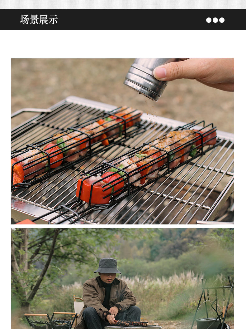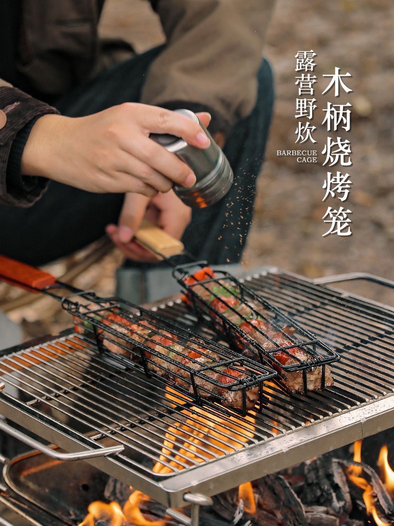 Cross-Border Wooden Handle BBQ Cage Outdoor Camping Meat Vegetable BBQ Net Rack Picnic Grilling Tool Charcoal Grilled Sausage Skewers