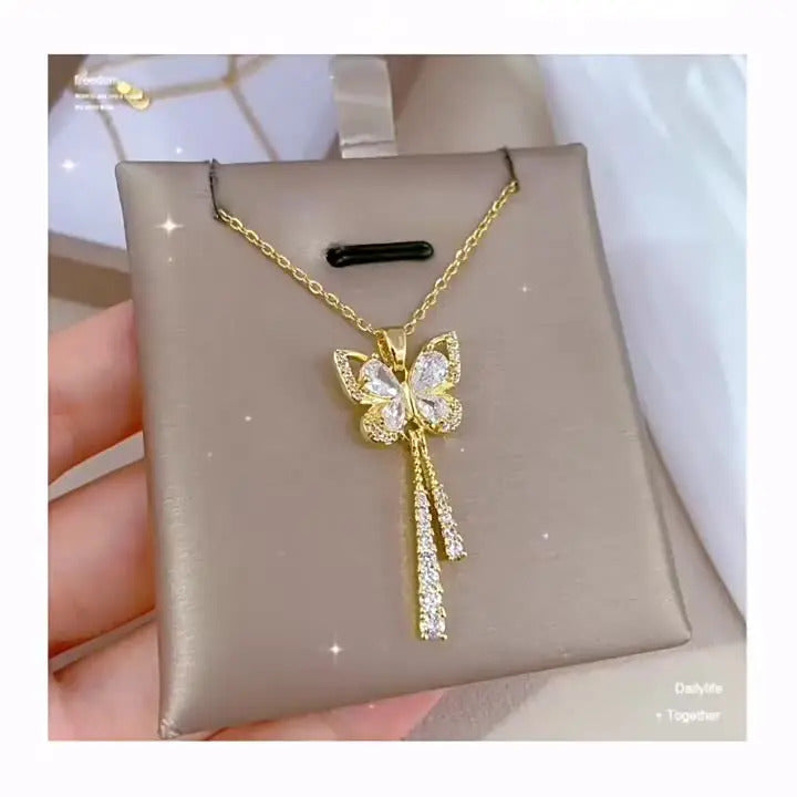 Exquisite Micro Inlaid Zircon Butterfly Tassel Necklace with Titanium Steel, Perfect Gift for Fashion-forward Women