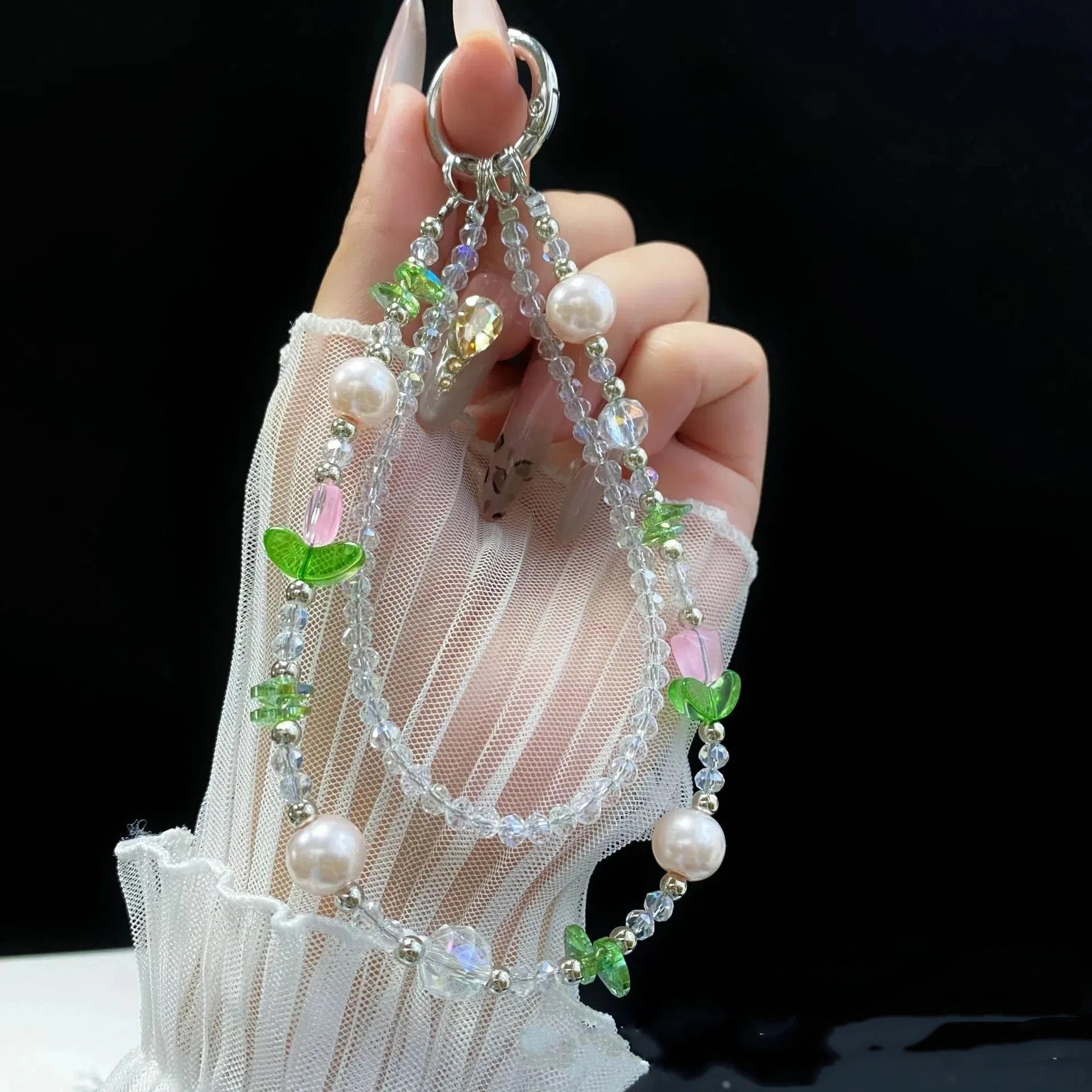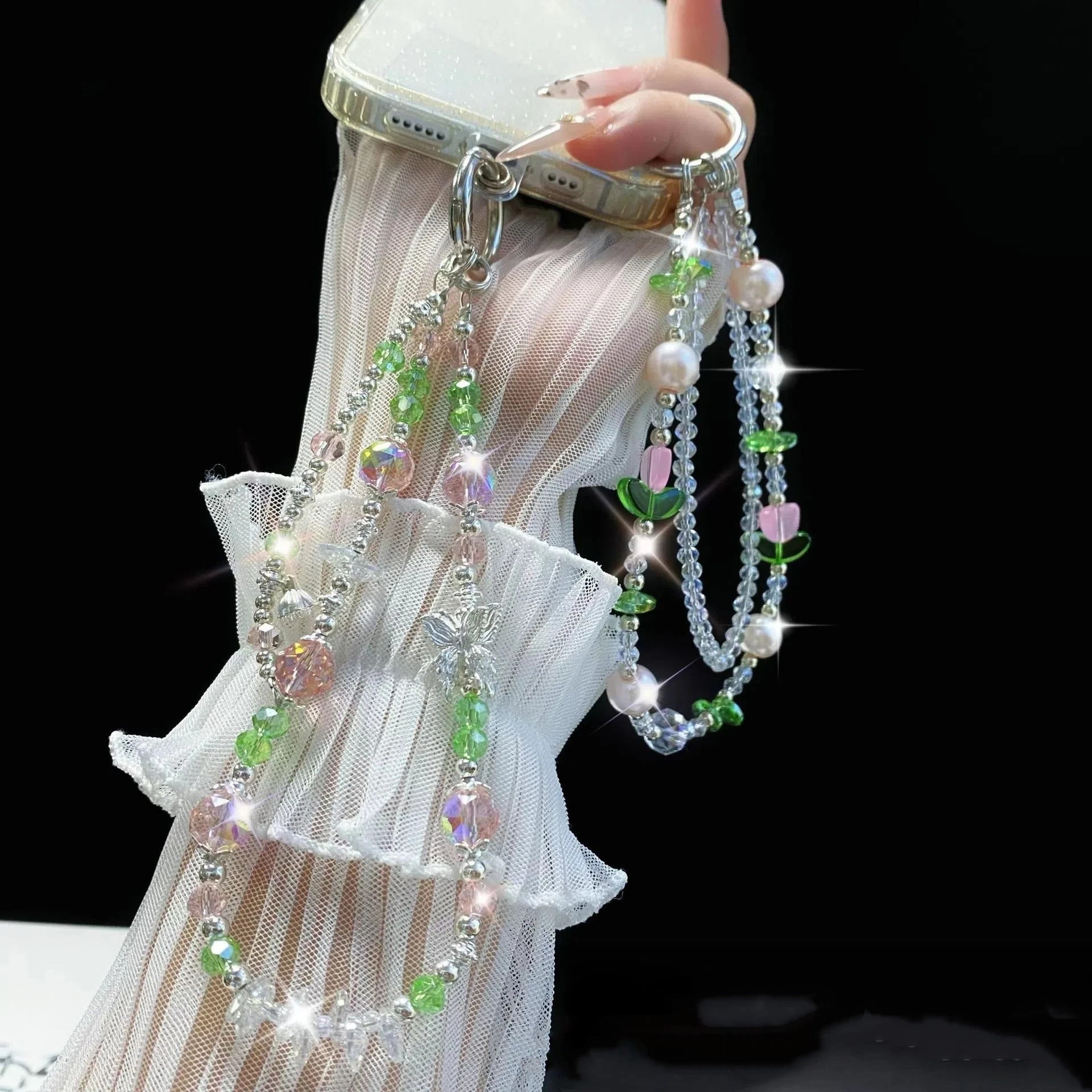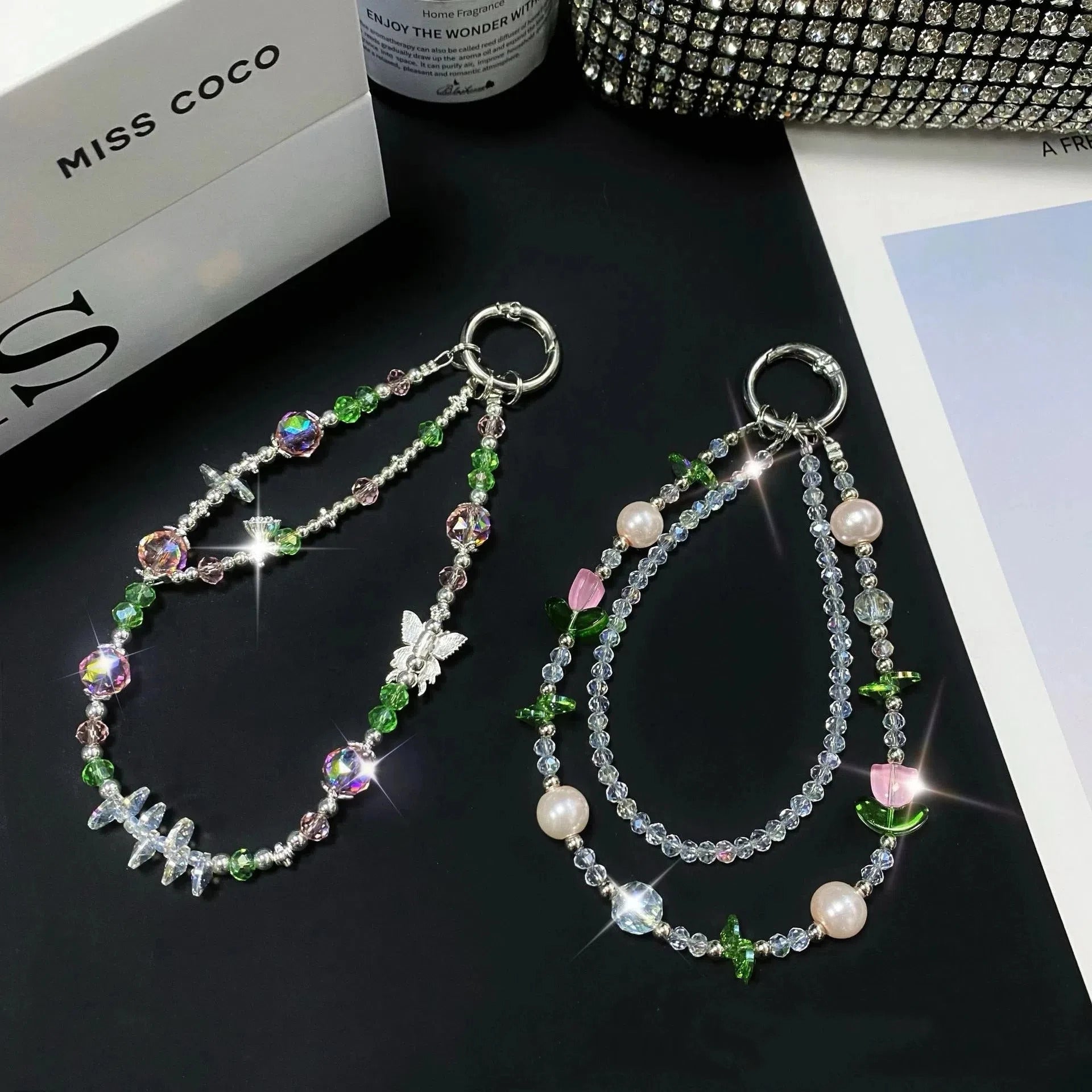 For 16 Mobile Phone Chain Dazzle Tulip Butterfly Double Chain Crystal 15 Mobile Phone Case Chain Lanyard Gradient Niche Fashion