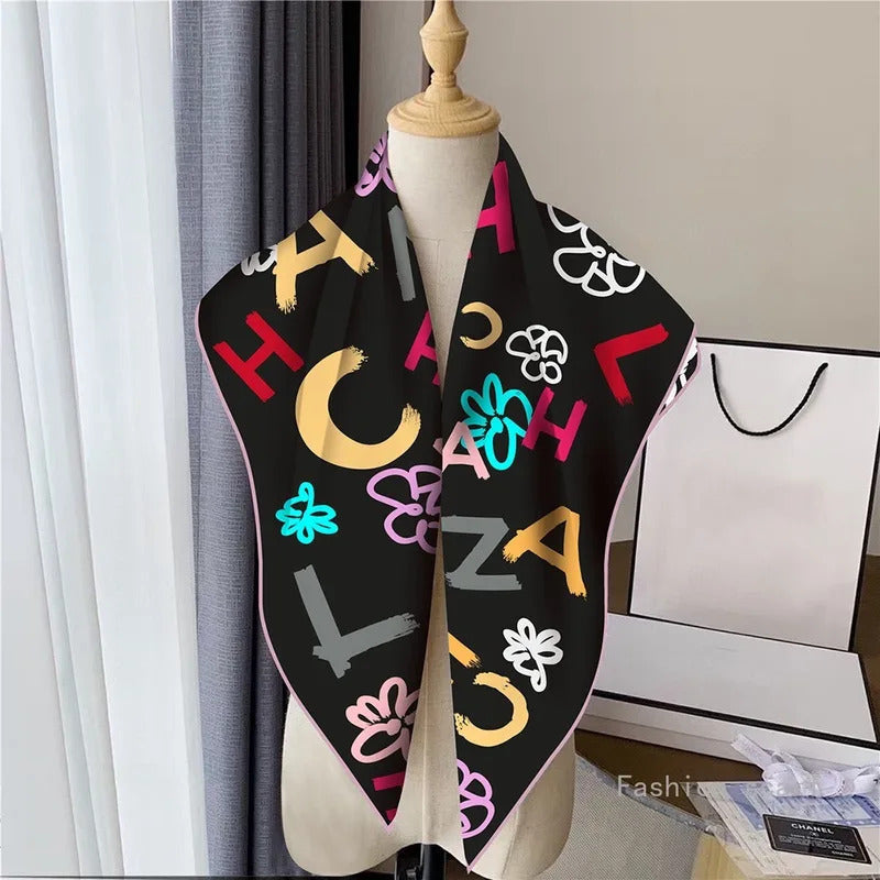 French Style New Black and White Letter Color Matching Women's Shawl Large Square Scarf Twill Silk Headscarf Scarf Wholesale