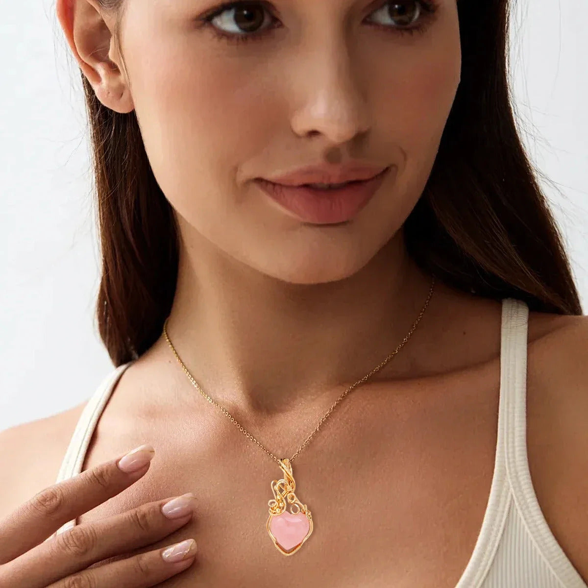 Gemstone Pink Crystal Heart Necklace Pendant Copper Wire Wrap Handmade Stainless Steel Jewelry Ladies Necklace Gift