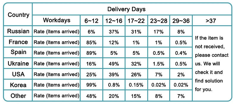 1.The normal delivery time is shown below.Moreover, we cannot guarantee the specific delivery time.