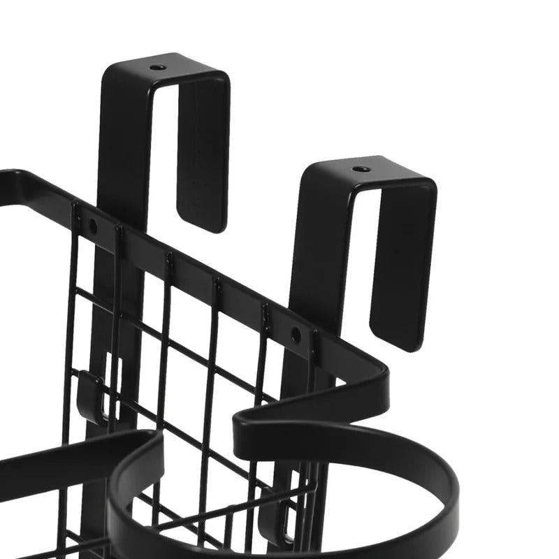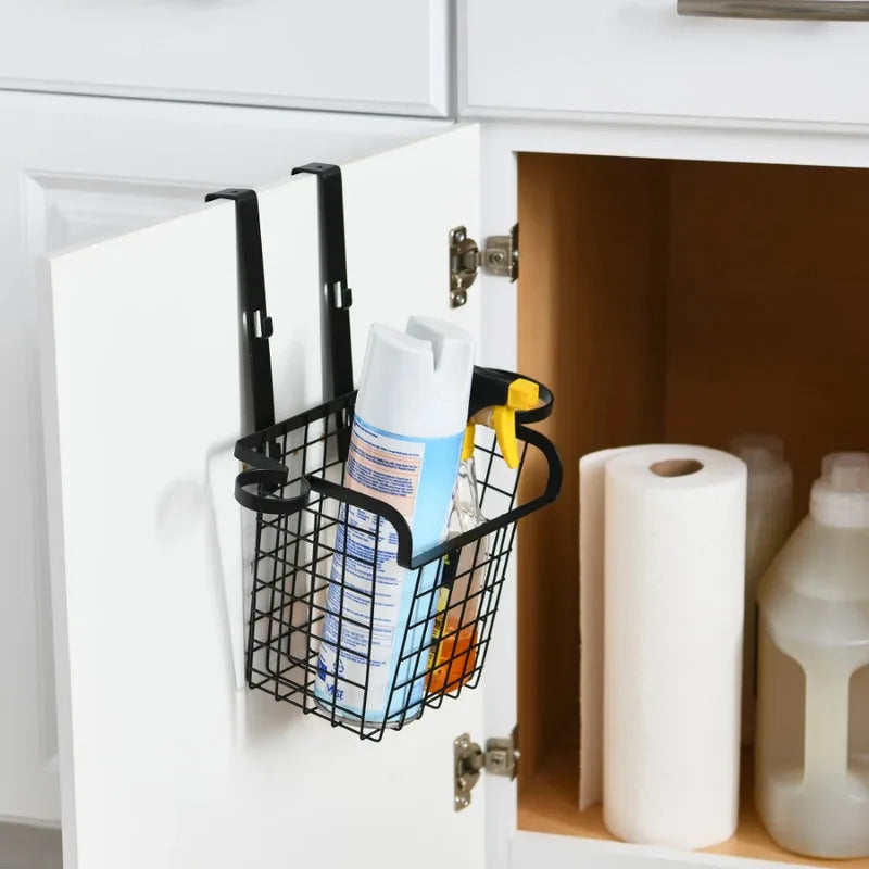 Black metal storage basket; designed to attach to cabinet doors for easy access to essentials