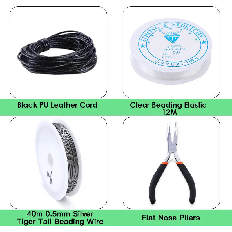 The jewelry wire set comes with 3 rolls of beading wires: 1 roll of crystal elastic stretch string, 1 roll of black PU leather cord, 1 roll of silver tiger tail beading wire.These are the necessities of making bracelets, necklaces, earrings, charms, hair accessories and other DIY projects.