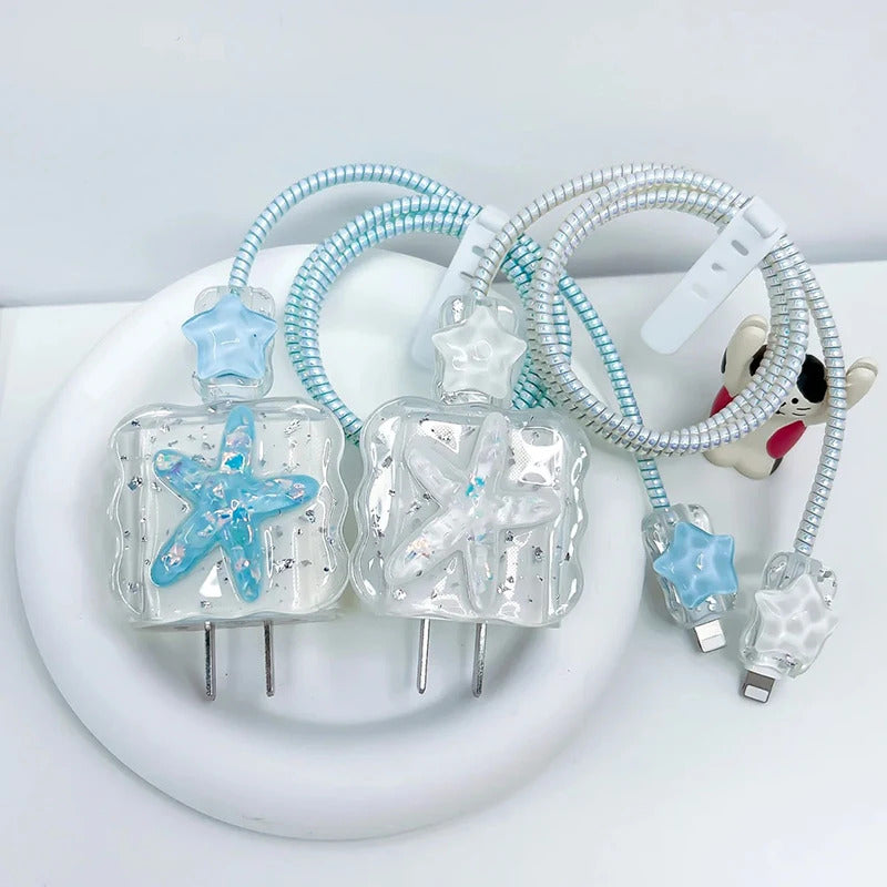 Korean Cute 3D Crystal Star USB Cable Protector Cover For iPhone 18W-20W Data Line Bite Head Cord Flower Fast Charging Case