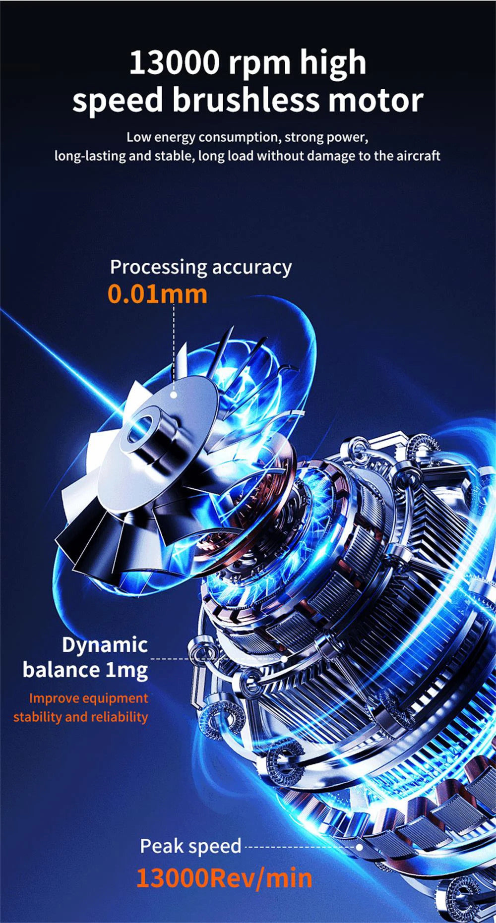 【13000 RPM High Speed Brushless Motor】:Low energy consumption, strong power, long lasting and stable, long load without damage to the aircraft