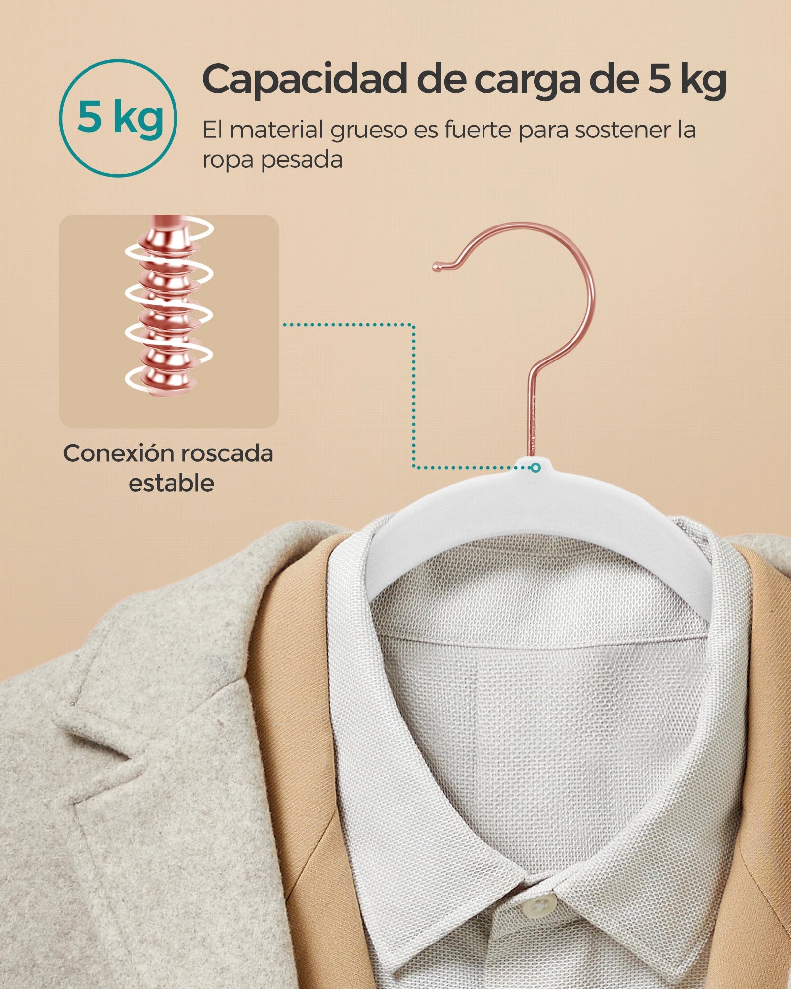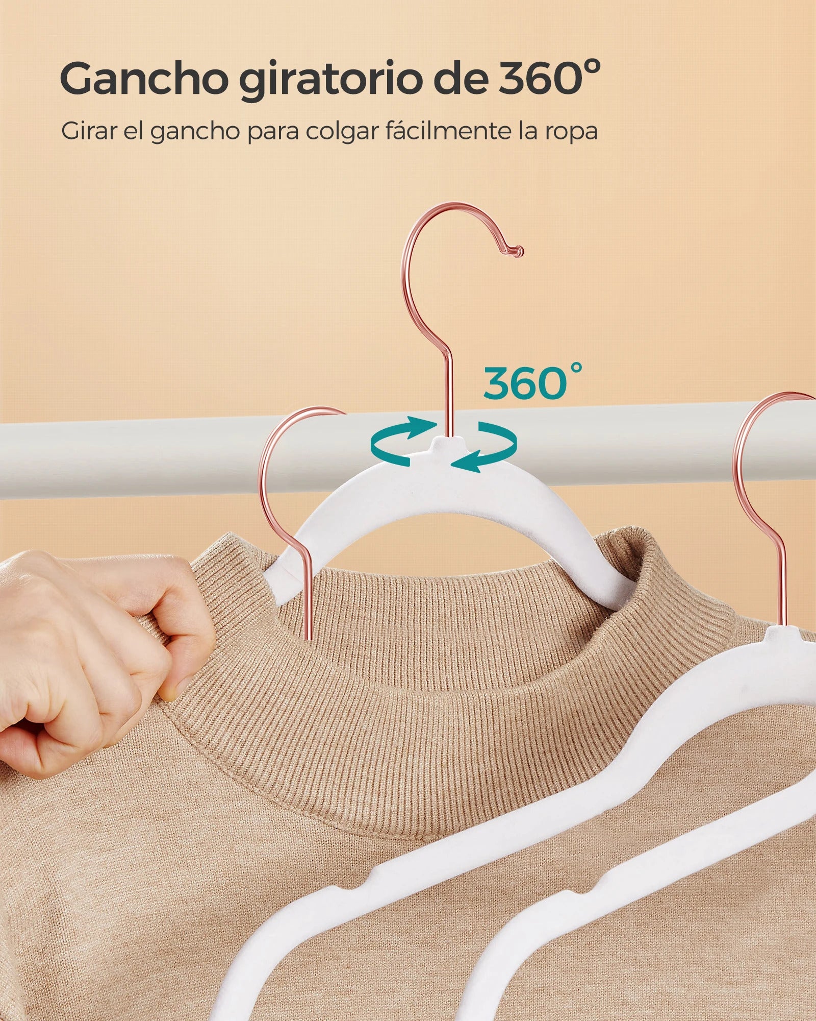 [What You Get] A set of 50 SONGMICS velvet hangers with 360° swivel rose gold-colored hooks, shoulder grooves, and a maximum load capacity of 11 lb (5 kg) each for an organized closet