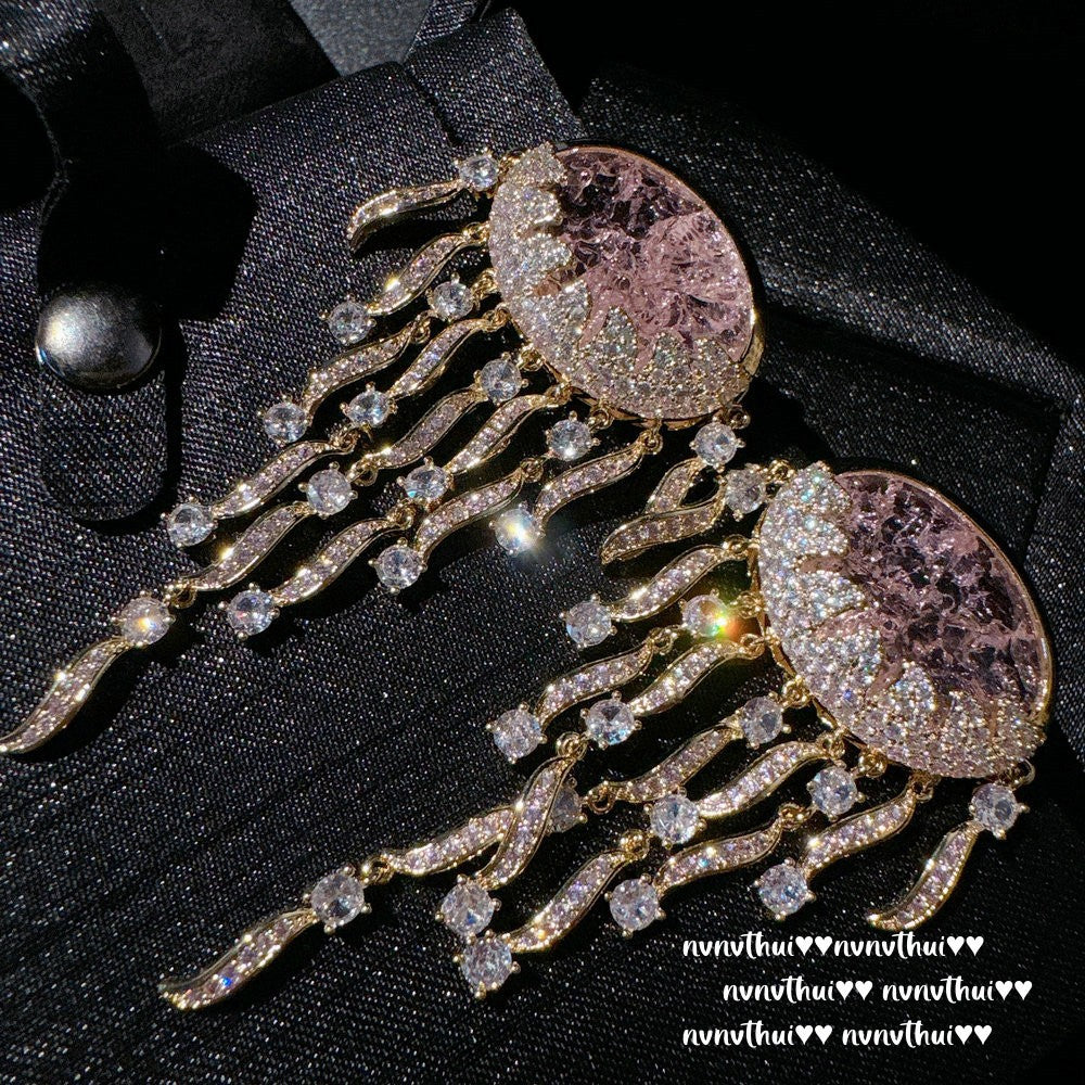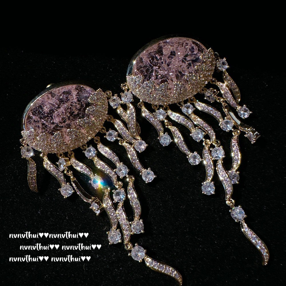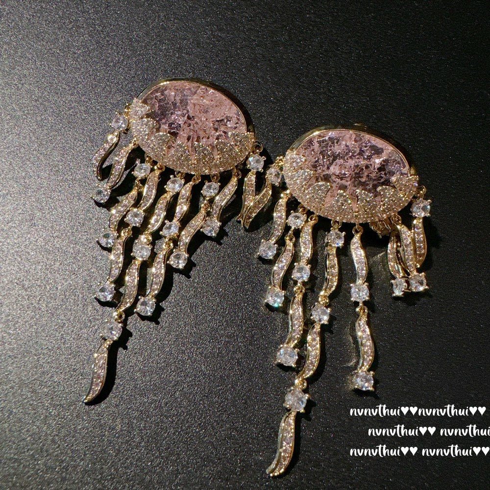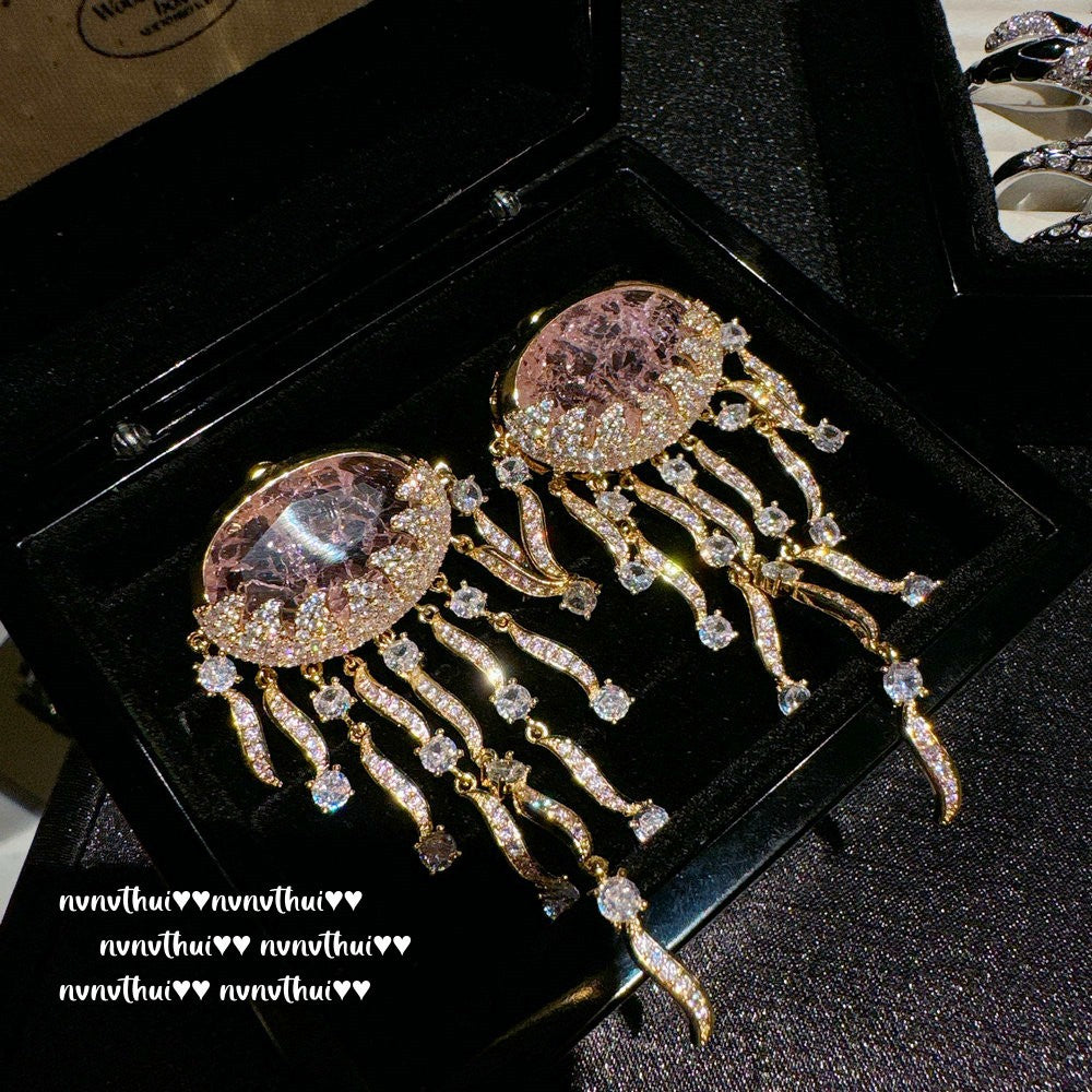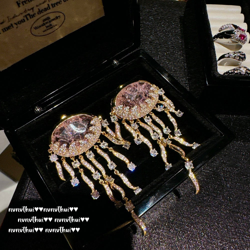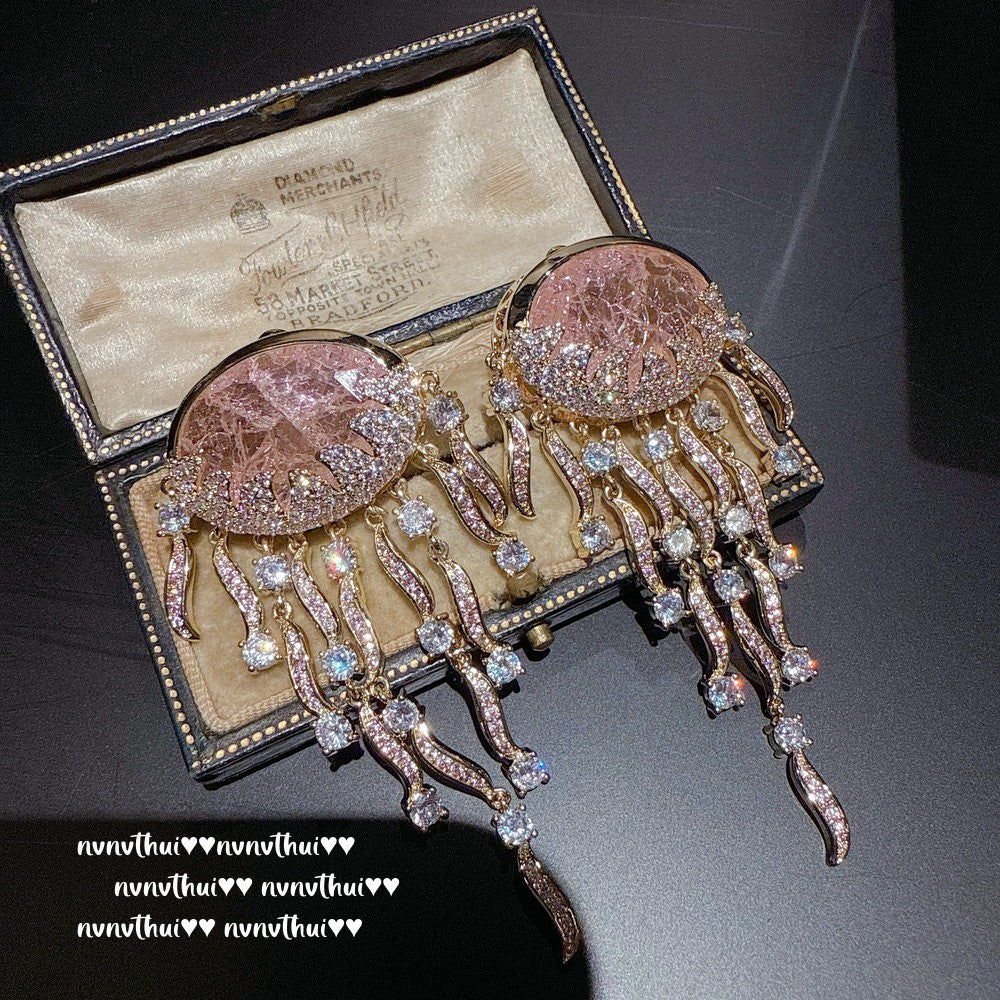 Sparkling PA Pink Cloud Pattern Jellyfish Tassel Gem Earrings Rich Woman's Happy Egg-Shaped Princess Pink Earrings