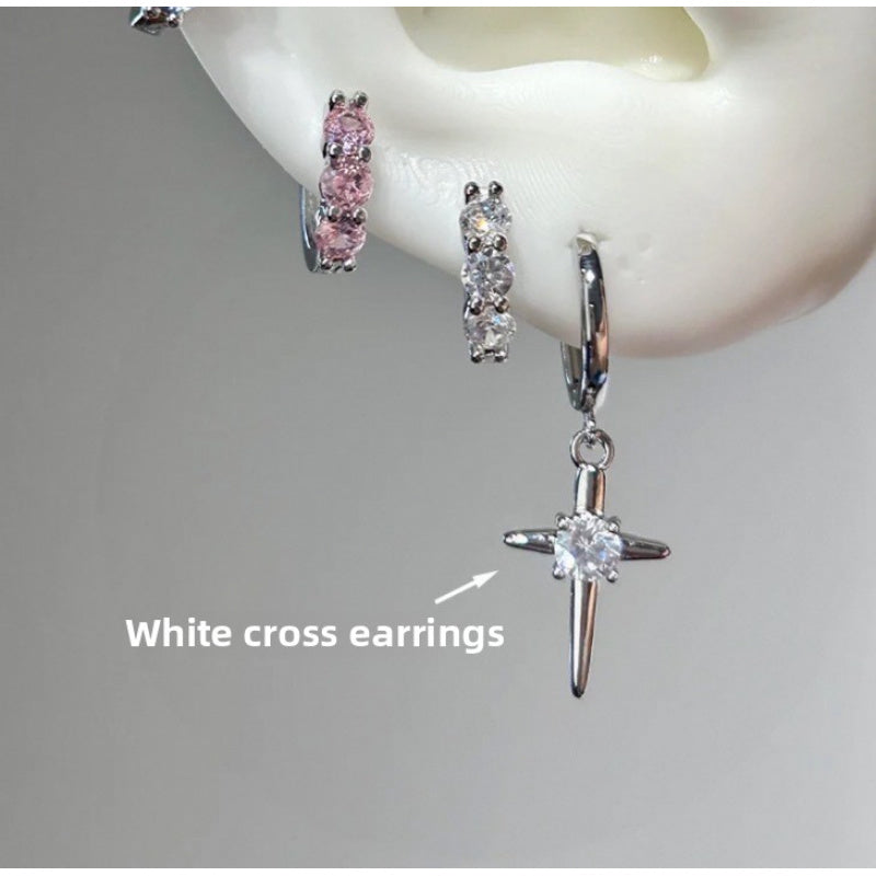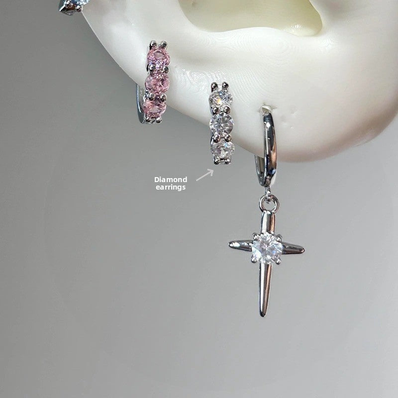 Sweet Cool Style Super Shiny Cross Earrings Cool Korean Sweet Temperament Double Ear Hole Ear Jewelry