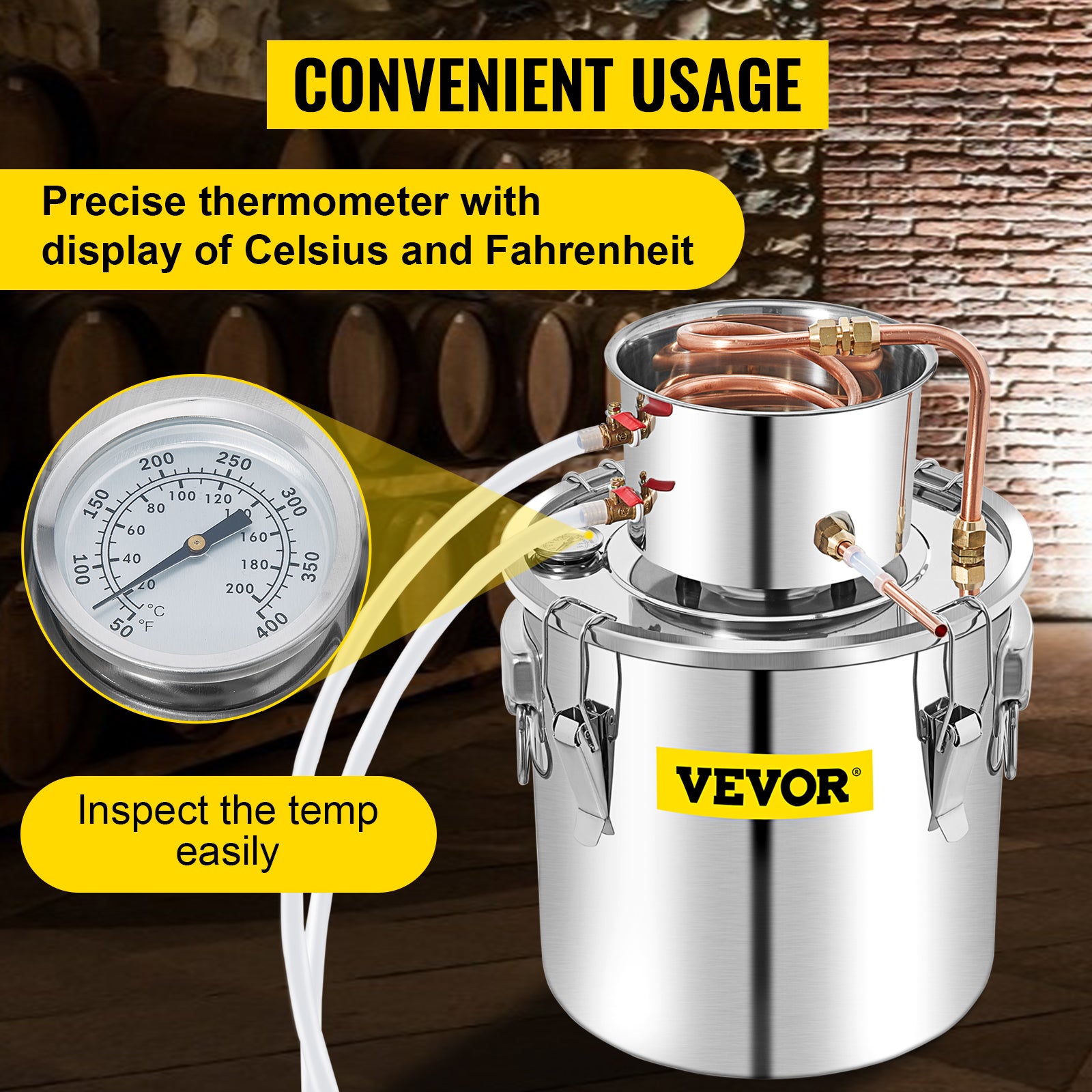 Easy to Operate: The alcohol still kit has a real-time thermometer on the lid, with a dual-display of Celsius and Fahrenheit, which is convenient for monitoring the temperature of the wine during the distillation process.