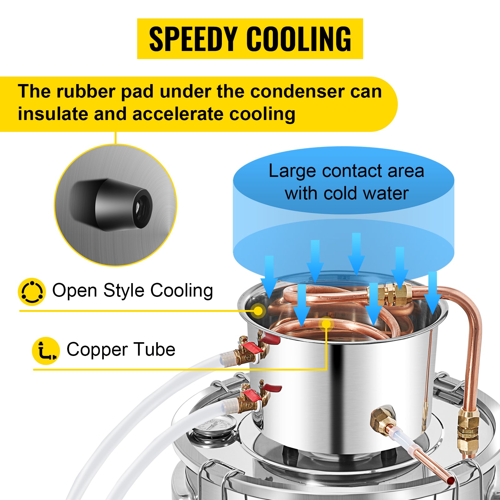 Rapid Cooling: The distillery kit adopts an open cooling method.The copper coil has rapid thermal conductivity and has a large contact area with the coolant, providing a lower distillation temperature.A circulating water pump is attached to save cooling water.The rubber pad under the condenser can insulate and accelerate cooling.