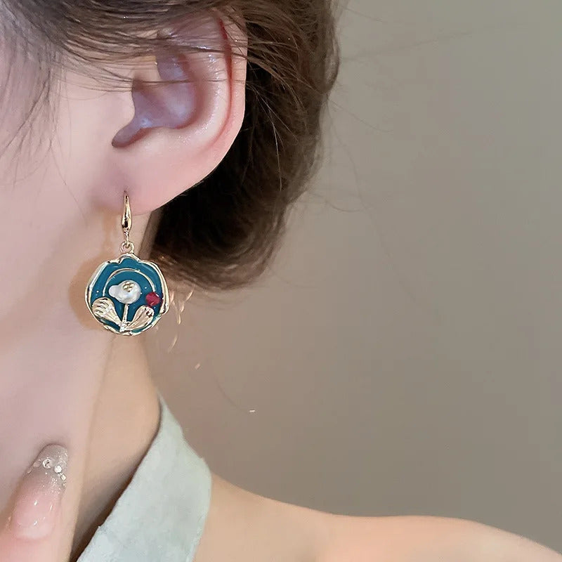 Vintage Oil Painting Style Flower Earrings Fashion Imitates Pearl Geometric Drop Earrings High-End Wedding Jewelry Accessories