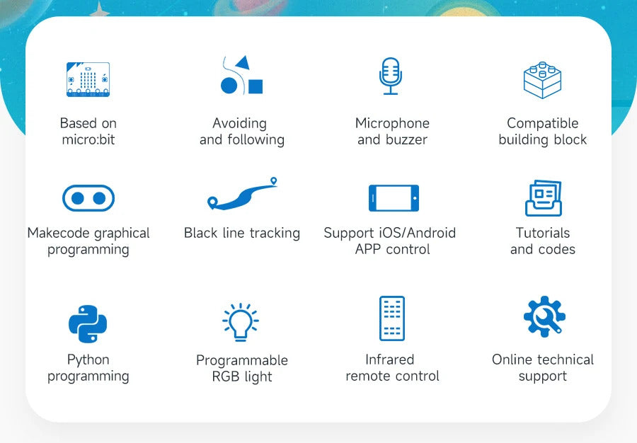 Intelligent obstacle avoidance, following, playing music, tracking,Interesting lighting and APP supporting.