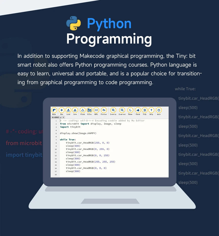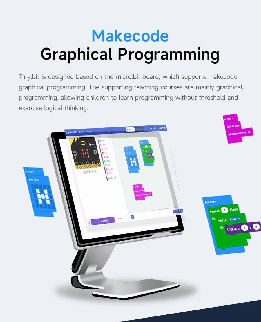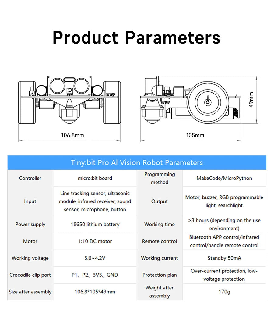 Tinybit is a robotic car for the microbit education market. It is compact, easy to assemble, and easy to move in tight spaces. The Tinybit smart car is based on the microbit development board design and uses the online code programming of MakeCode Editor. Rich sensor applications allow Tinybit for easy interaction. The Tinybit smart car has a set of alligator clips on the rear that can be creative and expand.